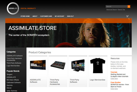 The ASSIMILATE Store is divided into four categories: ASSIMILATE software; third-party software; third-party hardware accessories; and ASSIMILATE logo merchandise.