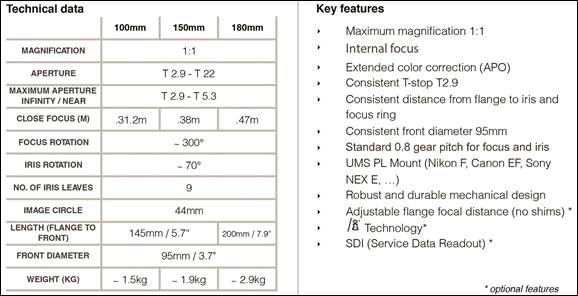 The new APO Macro FF lens family consists of 3 focal lengths: 100mm, 150mm, and 180mm.  The lenses feature full frame (24mm x 36mm) coverage, 1:1 magnification, consistent T-stop T2.9, as well as robust and durable cine mechanics.