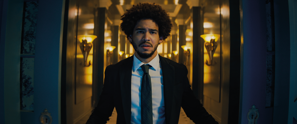 The daring use of colour throughout the film – lovingly paying homage to neon-noir goliaths such as John Wick and Blade Runner – was achieved by keeping it at the forefront of the minds of everyone on the production team, Bolter reveals. “A long time ago, Adam and I sat down with the script and went through it as colours. We wanted to plot out a visual journey for Benny and go down a rabbit hole – but avoid going too big, too soon. Initially, it’s elegant: moonlight and candlelight for the first party. For the second location, we introduce a blue neon to start to elevate it.” This, he explains, meant the whole production team – from costume to set – had a playbook from which to work. It also provided the framework to build on during production.