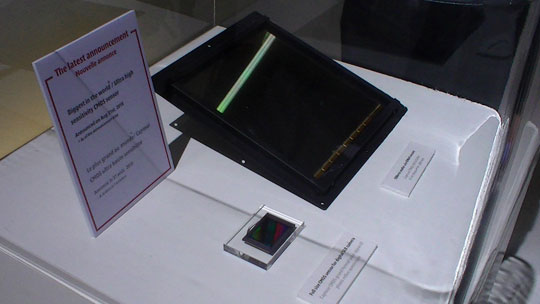Next to this was the huge 300mm ultra sensitive CMOS sensor with demos of starlight under 1 lux light. The chip size is actually 20cm, this is the largest CMOS sensor that can be made from a single 12-inch silicon wafer. Canon use a special circuit design to resolve the issue of signal transmission latency that is a problem in large sensors – otherwise known as rolling shutter. Canon claim they can shoot with a 1/100th of the light required when using a full-frame CMOS sensor.