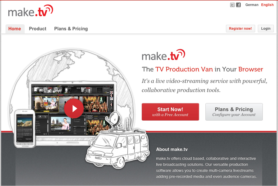 Described as a ‘TV Production Van is your browser’ is make.tv, one of the first companies to offer cloud-based production studio technology. Using a web based interface they promise to run a production suite with collaboration and interactivity with multi-camera streams and the ability to add pre-recorded streams. So like a normal physical live production environment but on the Internet.
