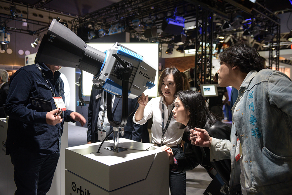 The entrance to IBC’s Hall 12 this year was guarded by Arri’s Orbiter. The company has a lot of experience in LED hard light, having been early to offer a range of Fresnels, though the Orbiter is more complex – perhaps an attempt to create a light that’s all things to all people. The promotional material mentions “sheer output” as a feature, and while the power level is more or less similar to an L10 Fresnel at around 500W, with the efficient, open-faced reflectors, the Orbiter should liberate more photons overall. Like anything at this power level, the Orbiter is just about usable away from a mains socket, requiring 48V input from a big floor-standing block battery.