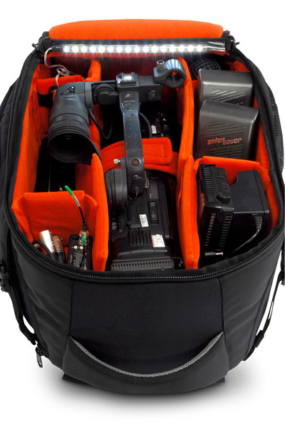 Petrol’s ergonomic backpack system is designed to provide correct weight distribution and greater carrying comfort. The bright orange padded central compartment has room to hold a Sony PMW-EX3, Panasonic HVX200/DVX-100B or similar size camera without disturbing the mic or viewfinder.