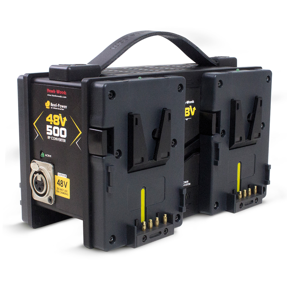 The second unit in the Hawk-Woods 48-volt family is the Reel-Power 48V-RP, which is identical in looks to the 48V-VL but uses the Hawk-Woods 26-volt Reel-Power fittings. This unit is ideal for any user who has a selection of Reel-Power batteries who may be already using them with 24v Arri film cameras, but would like to also power SkyPanel lighting.