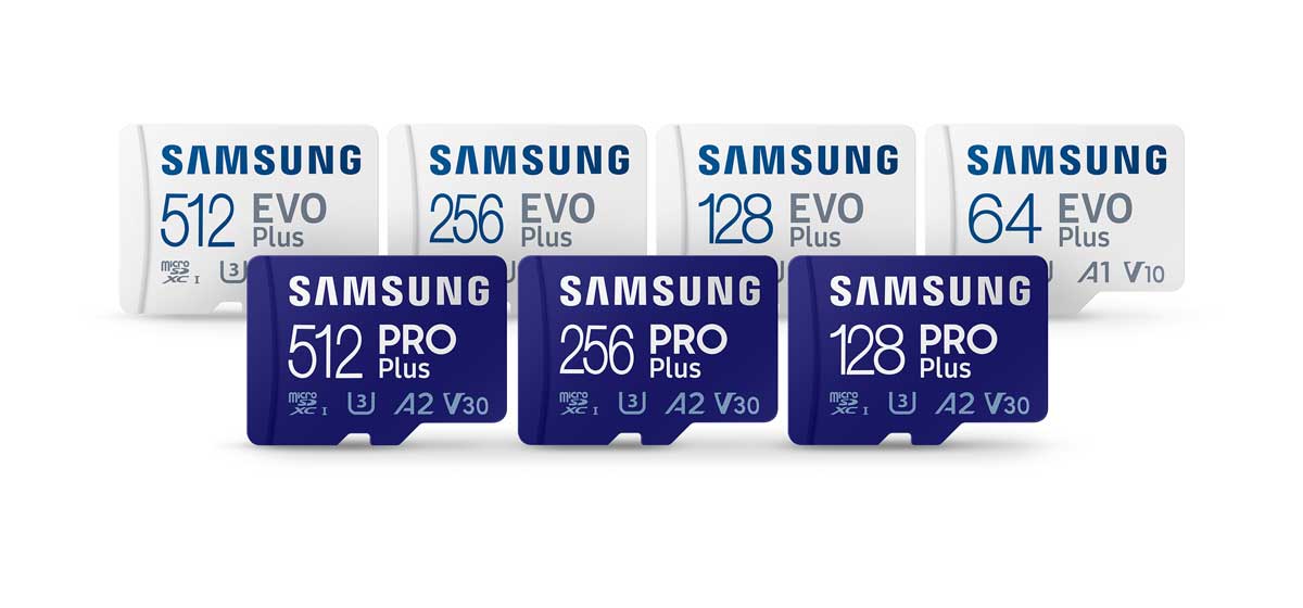 Both the PRO Plus microSD and enhanced EVO Plus microSD cards can be used to expand mobile device storage, capture high-quality photos and 4K Ultra HD video, and with action cameras and drones.