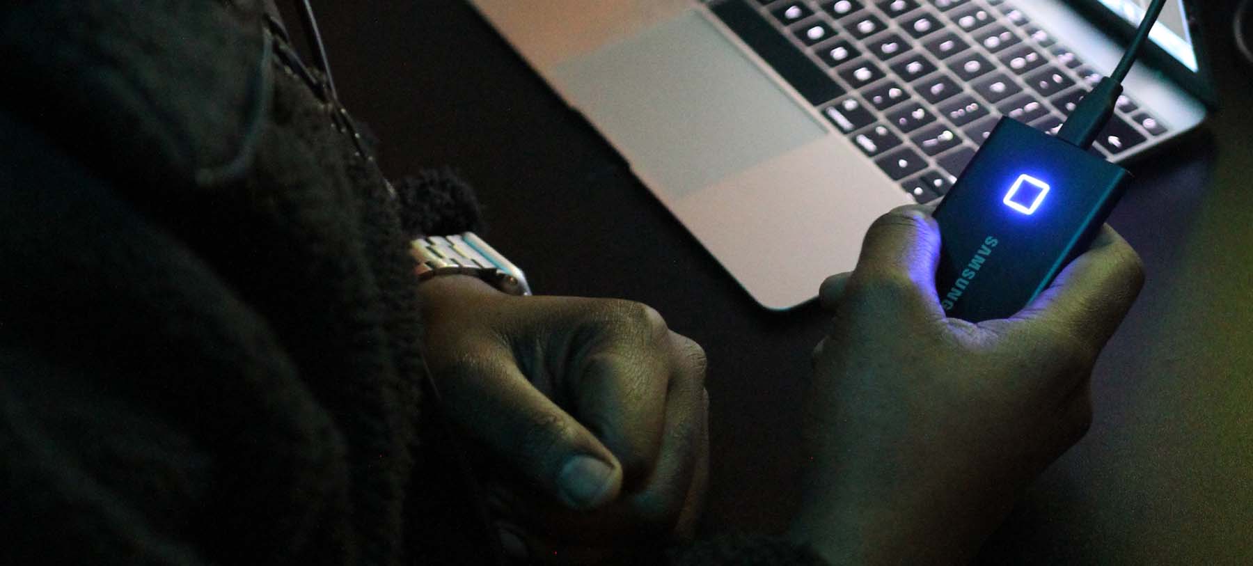 Young man holding Samsung Portable SSD T7 Touch at editing station