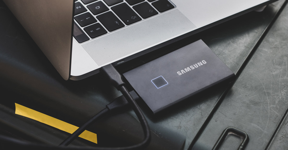 Samsung Portable SSD T7 Touch next to laptop on editing desk