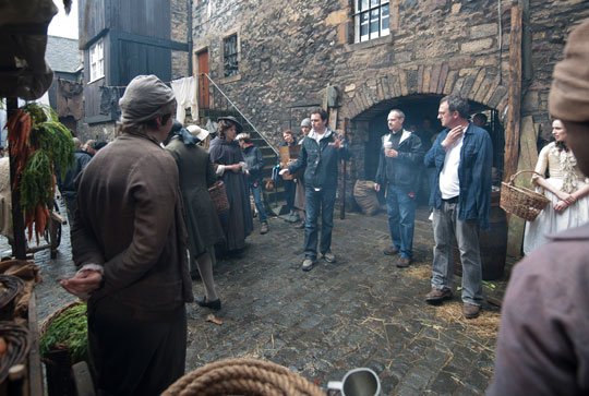 Gavin Struthers centre with coffee was the DoP“18th Century London was very dirty, noisy and smokey but in designing the ‘look’ it was important to remember the TX slot, this was a Sunday night BBC1 show, it had to sit comfortably in that slot but push boundaries, something the first series did exceptionally well. I added some dutched angles where appropriate and looked to using wide lenses for closeups where possible.