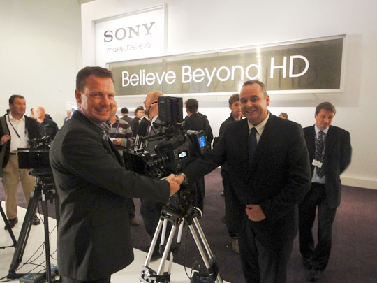 Left Mike Thomas, MD, Top Teks and Adam Fry from Sony AV MediaUK Sales and Rental operations Top Teks has ordered 10 x F65 packages on the Sony stand at IBC…just three days after Sony announced the pricing and availability.