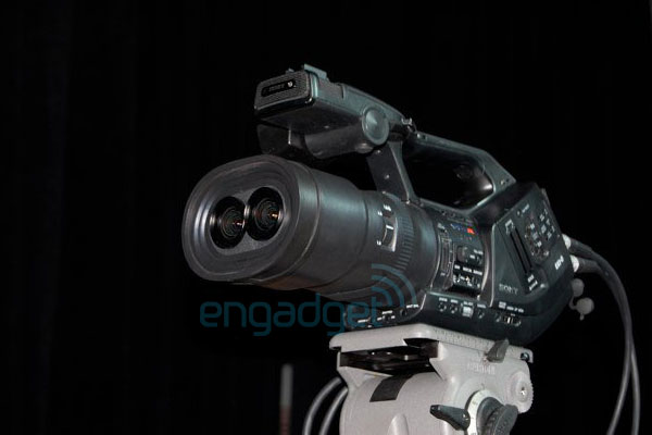 The conceptual Sony twin lens 3D camera, Pic © EngadgetDiscover Channel’s John Honeycutt announced details of a new Sony 3D camera at the recent SMPTE Digital Cinema Summit. More details came from the CML forum: Sony is “.. developing a new camera system for the needs of independent producers, especially ‘run-and-gun’ natural history. This new camera system is not a product announcement; it is a conceptual prototype in its early development. There is not a product plan yet. However, Sony and Discovery are working together to gather feedback. Field tests are scheduled to start in July.