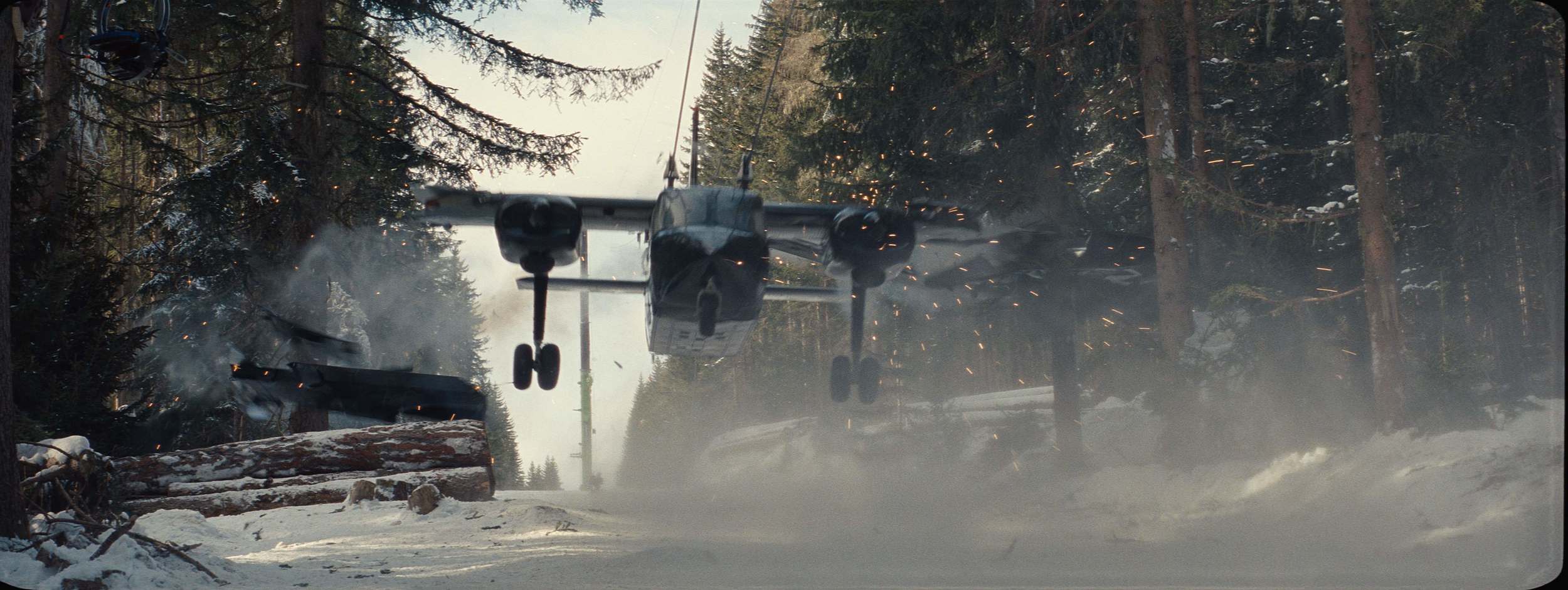 The team’s second challenge was to create a digital version of the snow plane Bond uses to pursue villains through the Austrian Alps. MPC’s modeling team created the CG plane based on the Britten-Norman Islander. The biggest challenge for the sequence was with the way the plane interacts with its environment during the chase. On set, a practical plane was built and pulled along on wires, wheels and skis through the forest. By mixing sections of the practical plane with the full CG digital version, MPC was able to create a plane that has its wings torn off and then careens on its belly while still under power from its two propeller engines. MPC’s FX team created billowing snow clouds blown up from the engines, a powerful bow-wake of snow from the sliding belly of the plane and streams of smoke and fire from its struggling engines. Add to this the climactic moment when the plane bursts through a barn, scattering smoke, wood and fire, and you have yet another iconic Bond chase sequence to add to the long list of classic film moments.