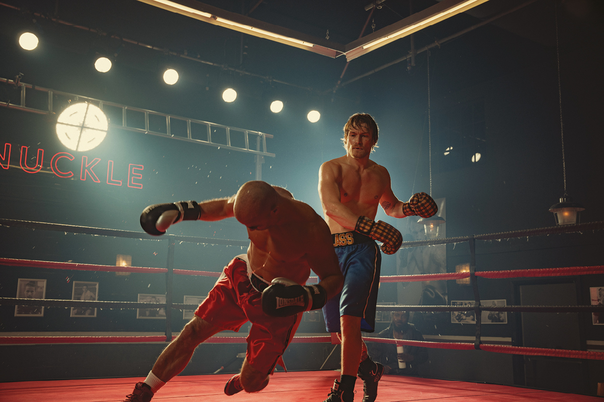 Green took several creative liberties when bringing the scene from script to screen. “On paper, that [sequence] read as, ‘Jack Glass (Harry Goodwins) is having a fight, he’s winning and then we cut to Susie (Kaya Scodelario) and Eddie (Theo James) watching it, and they’re excited’,” he shares. To make the whole thing more lively, Green and his crew ‘decided to shoot it at 1000fps, then speed it down to 24 when [Jack] hits the canvas, then whip off that and push into Susie and Eddie’. He concludes: “We were always trying to keep the camera moving,” with the result a fast-paced montage of grit and glory.