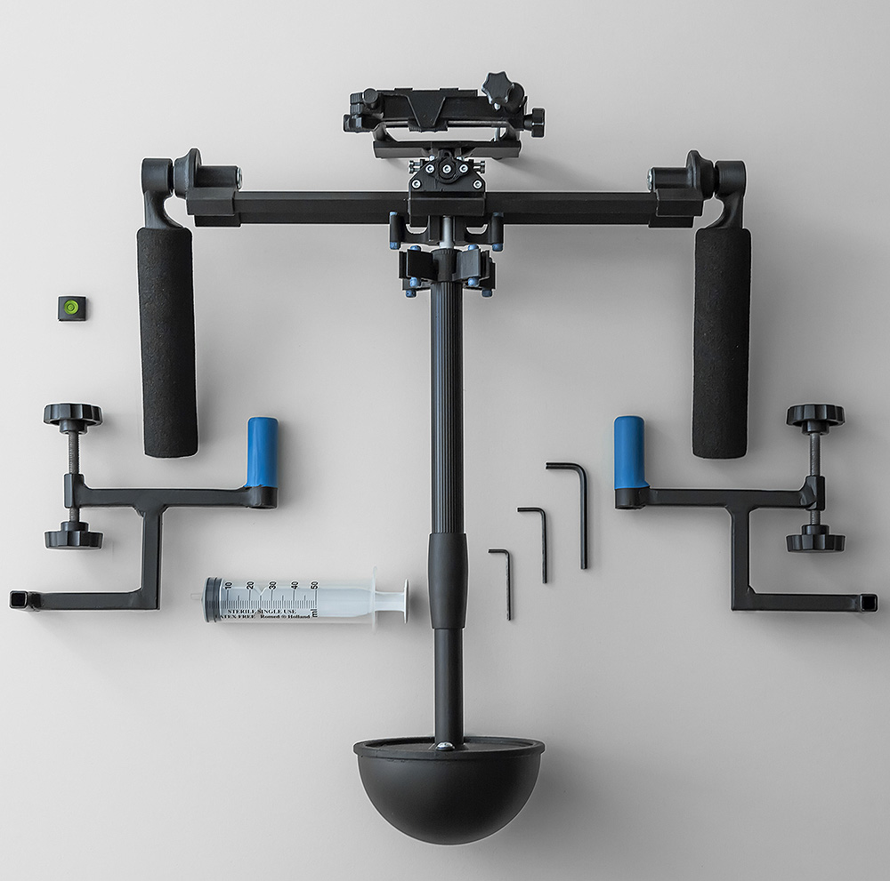 The heart of the balancing act is the balancer tank, just fill it with water and then find your balance. The company’s promise is to eliminates the ‘pendulum effect’ you get when shooting with other counterweighted gimbals. Water is used as counterweight. In the swinging tank the damped flowing fluid changes the centre of gravity while forcing the rig to stay vertical.