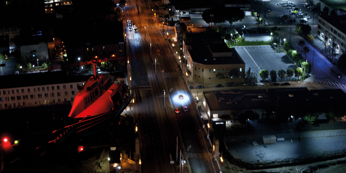 “One of the big sequences is a police chase through Downtown LA. Suspects are escaping in a car and a police helicopter is following overhead. You see the city and the vehicle below, as well as the helicopter itself from an even higher perspective. Police are tracking with a spotlight as it weaves through the streets,” describes Nelson.