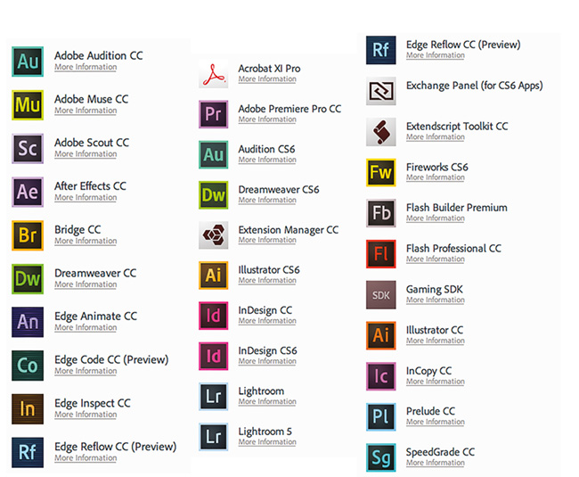 Adobe’s current roll call of Apps in their Creative Cloud.