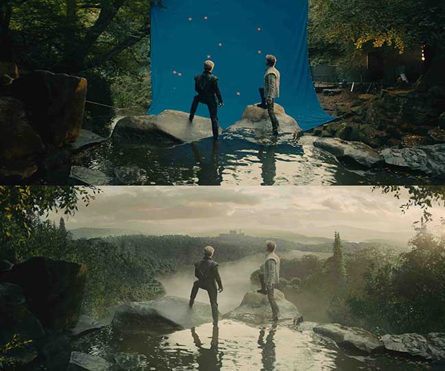 The Establishing and aerial shots of the forest in Into The Woods were real forests shot on location, while the sequences which take part inside the woods were all built at Shepperton Studios and then digitally enhanced by MPC’s environment team. A wide vista was created as a digital matte painting in order to portray the vast lands both Princes lives in. Rapunzel’s tower was an important element in the environment work. While some shots of the Tower were filmed at Waverly Abbey in many shots the tower is a full CG model created by MPC.