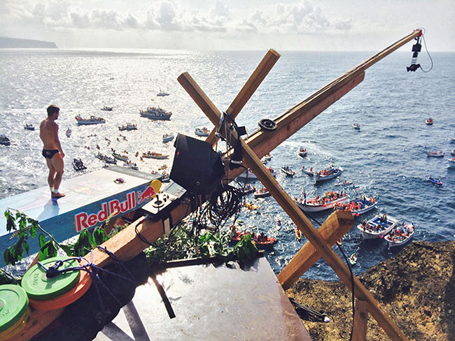 John explained “With no chance of getting a replacement jib of any kind, we thought ‘can we build one then?’ Well we could, or should I say the two Red Bull riggers could. With their skill and ingenuity they cobbled together a wooden jib arm, 15ft long, using left-over pieces of timber from the just-rigged diving platform. I was then able to cable tie, nail and screw my camera, hot head, cables, monitor, batteries and operating controls to the boom. Thank God those bits arrived!!! Hats off to them for helping me get the shots! I had 2 different cameras with me, a Toshiba HD1 and a Camera Corps HD mini zoom. I decided to use the Camera Corps camera as this had the zoom lens which would help amplify the limited movement I had with the jib.”