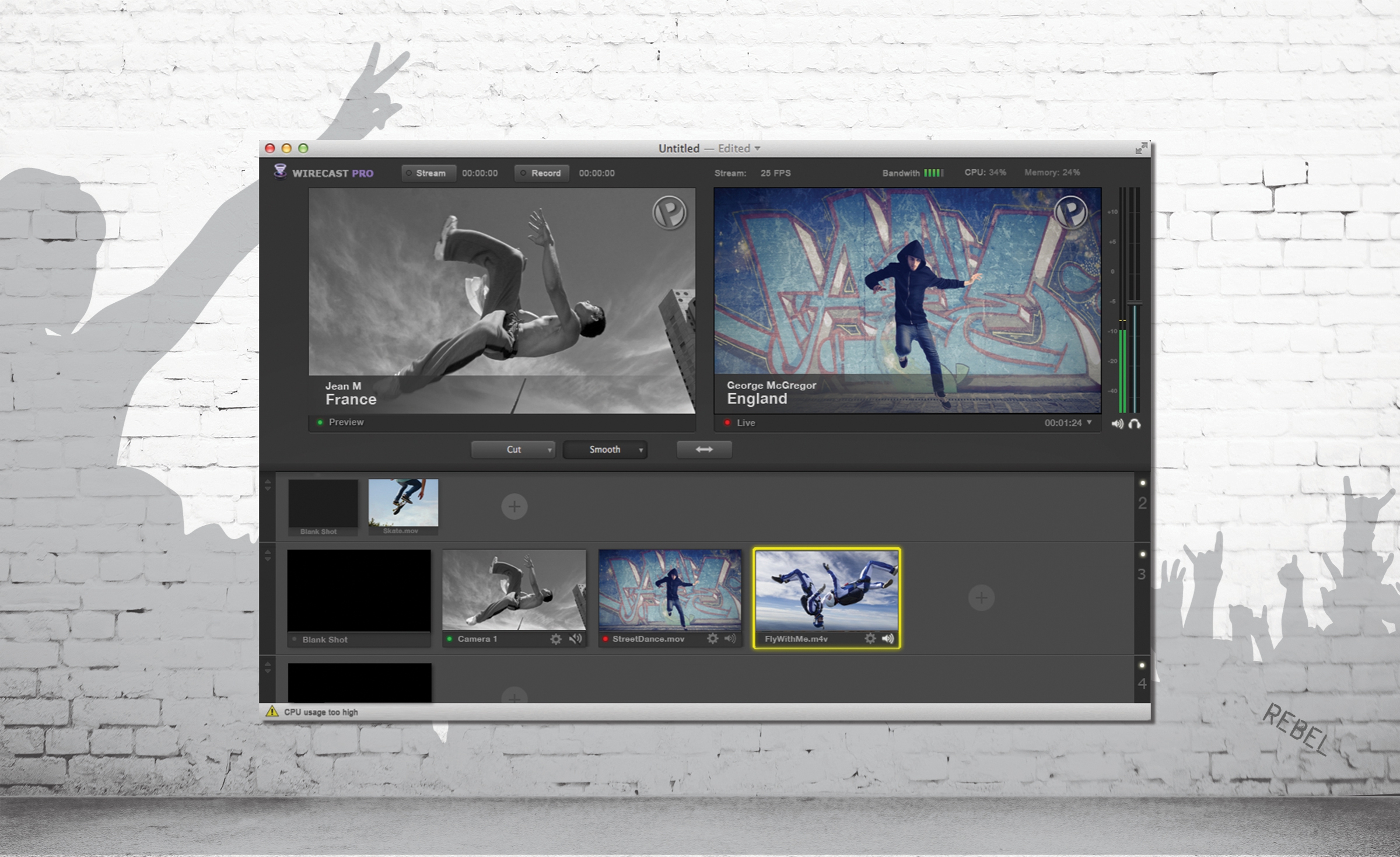 With Wirecast, users can switch between multiple live cameras while dynamically mixing in other media such as movies, images and sounds, and adding production features such as transitions, built-in titles, chroma key support, virtual sets and live scoreboards.