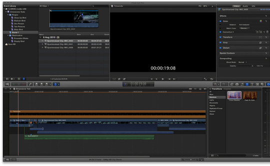 The next thing you’ll need to do is log and organise your footage and sync it up to the sound recordist’s files. The first thing you’ll notice is the absence of anything like a Bin, which is one of the things that the existing FCP community is screaming about. Indeed, I hated it at first, but I’m going to stick my neck out and say that the new way of organising your footage is better. Apple have a new paradigm in all their applications, which is that you shouldn’t need to know where a file is kept – you locate everything through its metadata (just look at iPhoto, iTunes and so on). In FCP X, therefore, you set up an Event, into which all your footage is imported. FCP X can automatically scan the incoming footage and identify singles, two shots, wides and so on – you get a sort of sub-event for each of these. You can also add keywords to your clips (Scene 1, for instance) and a new sub-event is created for this. Add the Scene 1 keyword to other clips, or just drag them into the sub-event to gather together all your clips for that scene. Clips can have multiple, overlapping keywords, so that they appear in multiple sub-events. A single keyword, therefore, can act like a Bin, but is considerably more powerful. You do have some control over where the top level Event is stored, but only at the disc volume level.