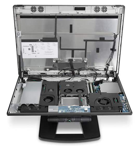 Once the Z1 is raised into working position on its stand (which isn’t entirely straightforward, given the weight of the thing), there is an equally impressive array of external ports. The right hand side has the optical drive (DVD with Blu-ray as an option), a “4-in-1” media card (SD) reader, Firewire 1394a, two USB 3.0 ports and audio I/O. There is a 1080p webcam, mic and speakers on the front (as well as, obviously, the monitor – more on that later). The rear features the mains inlet, more audio I/O (including a line-level sub-woofer output and S/PDIF), four USB 2.0 ports, DisplayPort I/O and an RJ-45 for gigbit ethernet. For some reason, HP chose to position all these rear connectors directly in front of the stand, so they are tricky to get at. In fact, the IEC mains cable has to bend to get around the stand as it exits the chassis. Life would have been much easier if they had just offset this panel to one side.