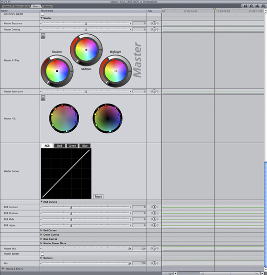 Anyone familiar with Colour (or even FCP’s built in 3 way colour corrector) will recognise the principles of Colorista II. There are three main sections, a Primary correction section, Secondary and Master. Primaries are usually used to correct exposure and colour balance from clip to clip in a scene, the Secondary section is for adding special effects (perhaps to turn that boring beige dress into a sexy scarlet gown), and the Master section can be used for an overall ‘look’. The three sections have subtly different controls.