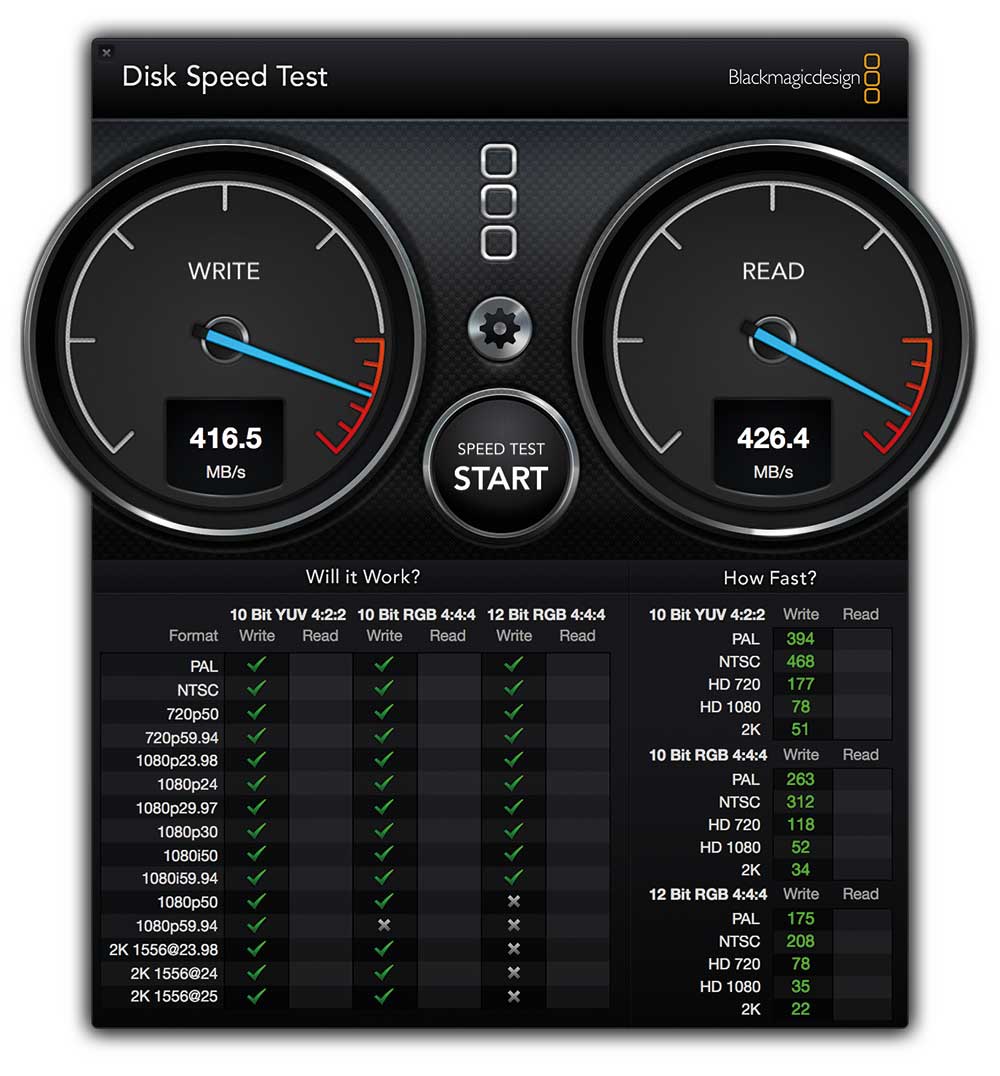 The speed increase is most noticeable writing to the drive – Blackmagic’s Speed Test reporting 416MB/s against the older drive’s 373MB/s. Both the T5 and the T3 use a small, faster area of memory as a cache to increase write speeds, but these performance figures seemed pretty consistent, irrespective of the size of Blackmagic’s test file. Read speeds were almost identical to the T3, at around 426MB/s.