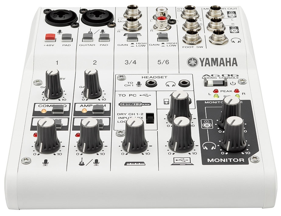 There are currently two models in the range – the AG03 and the AG06. Both feature a USB computer interface, analog mixer section, and digital effects. They have a sturdy metal chassis, stereo monitor and headphone outputs (each with independent volume controls) and can be bus powered from the USB. The AG03 is a three channel mixer with a line/mic input (featuring Yamaha’s excellent D-PRE mic preamp) with phantom power, a line/guitar input (stereo in line-in mode) and the input from the USB.